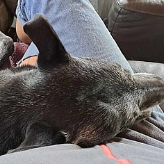 He was scare to come into the house at first, but soon discovered the pleasure of snuggling up with his hooman on the couch. He will only come inside when invited (he currently sleeps in a crate inside) and is very respectful when in the house, just happily climbing up onto his mat on the couch and taking a nap but he'll also get off when told as well.