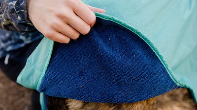- Waterproof shell fabric contains moisture absorbent microfiber lining and belly panel soaks up water and grime