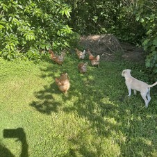 Hobbies: Going for walks on the property, playing in the stream, hanging out with his hoomans, playing with his sister, exploring new places, sniffing, chewing cow hooves, playing with his toys, doing zoomies around the garden, problem solver